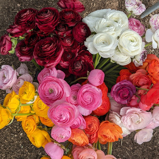 My first year growing ranunculus was more than just a little cringeworthy. I took a flower farming course where I first discovered their existence. I quickly learned what I needed to do and got my hands on some corms. I followed the instructor's steps: soak in water, pre-sprout in trays, and plant after the first shoots appear. I started with 100 ranunculus corms in a small row in the high tunnel carved out between the hydroponic lettuce and tomatoes. I tucked them into the ground and started dreaming about the armloads of flowers to come.